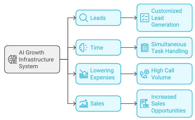 The AI Growth Infrastructure System is designed to resolve four major pain points faced by businesses. By leveraging advanced technology, this system enhances lead generation, saves time, lowers expenses, and boosts sales opportunities